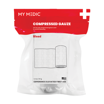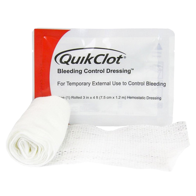 The QuikClot Bleeding Control Dressing fills the need for an OTC hemostatic dressing for home emergencies as well as professional first responders and medical personnel. The bleeding Control Dressing combines surgical gauze with Kaolin, a proprietary inorganic material that accelerates the body’s natural clotting process and stops venous and arterial bleeding within minutes of application. QuikClot devices do not contain any animal, human, plant or shellfish materials so there is no worry of initiating an allergic response. Kaolin produces no exothermic reaction so there is no burn! The soft, pliable nature of gauze conforms readily to the wound site, won’t break down, and can be easily removed once clotting has occurred. The rugged, easy-tear pouch provides durability and quick access when needed. This rolled dressing is sized for small-medium injuries. Made in the U.S.A. Works Fast Easy to Use Convenient