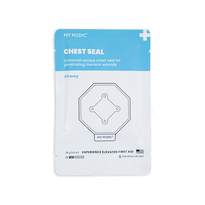 Designed for the management and treatment of an open and/or tension pneumothorax which may have been caused by a penetrating chest trauma. The innovative feature of these chest seals uses 4-vented channels which allow air to escape the chest cavity during exhalation but prevent airflow from entering through the injury site during inhalation. Advanced adhesive designed to overcome obstacles, such as blood, sweat, dirt, and other contaminants.